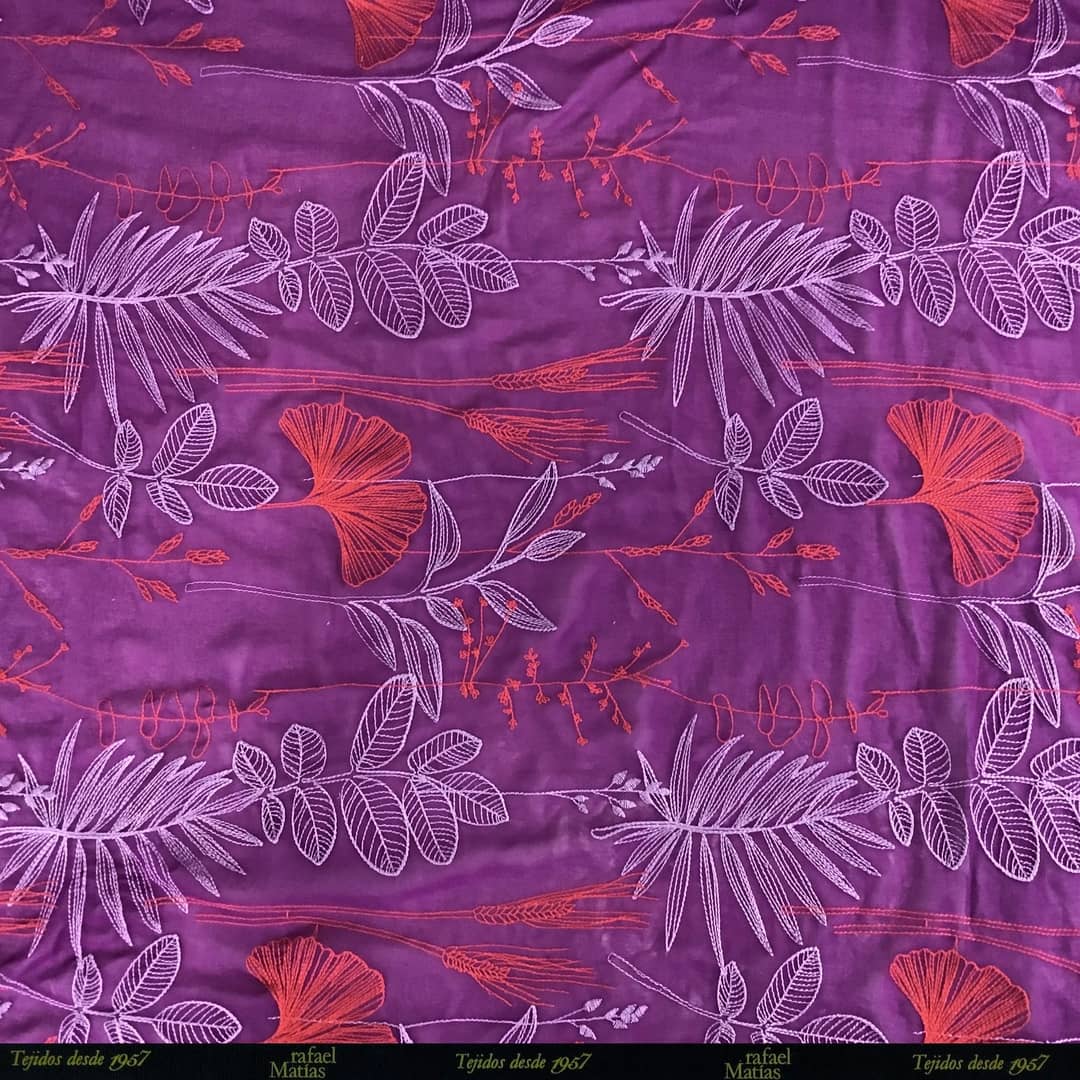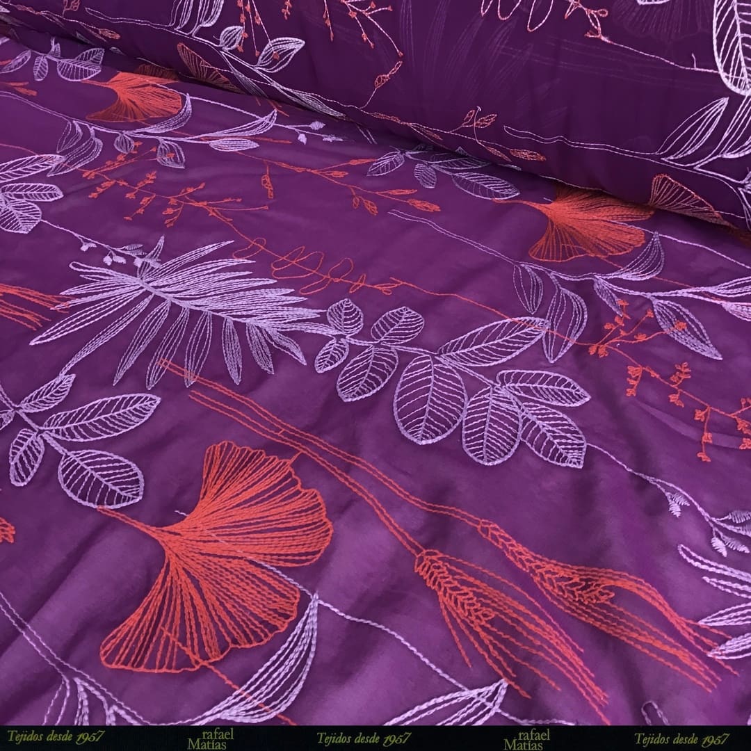 Tela Georgette Bordado Flores Cardenal Coral y Lila